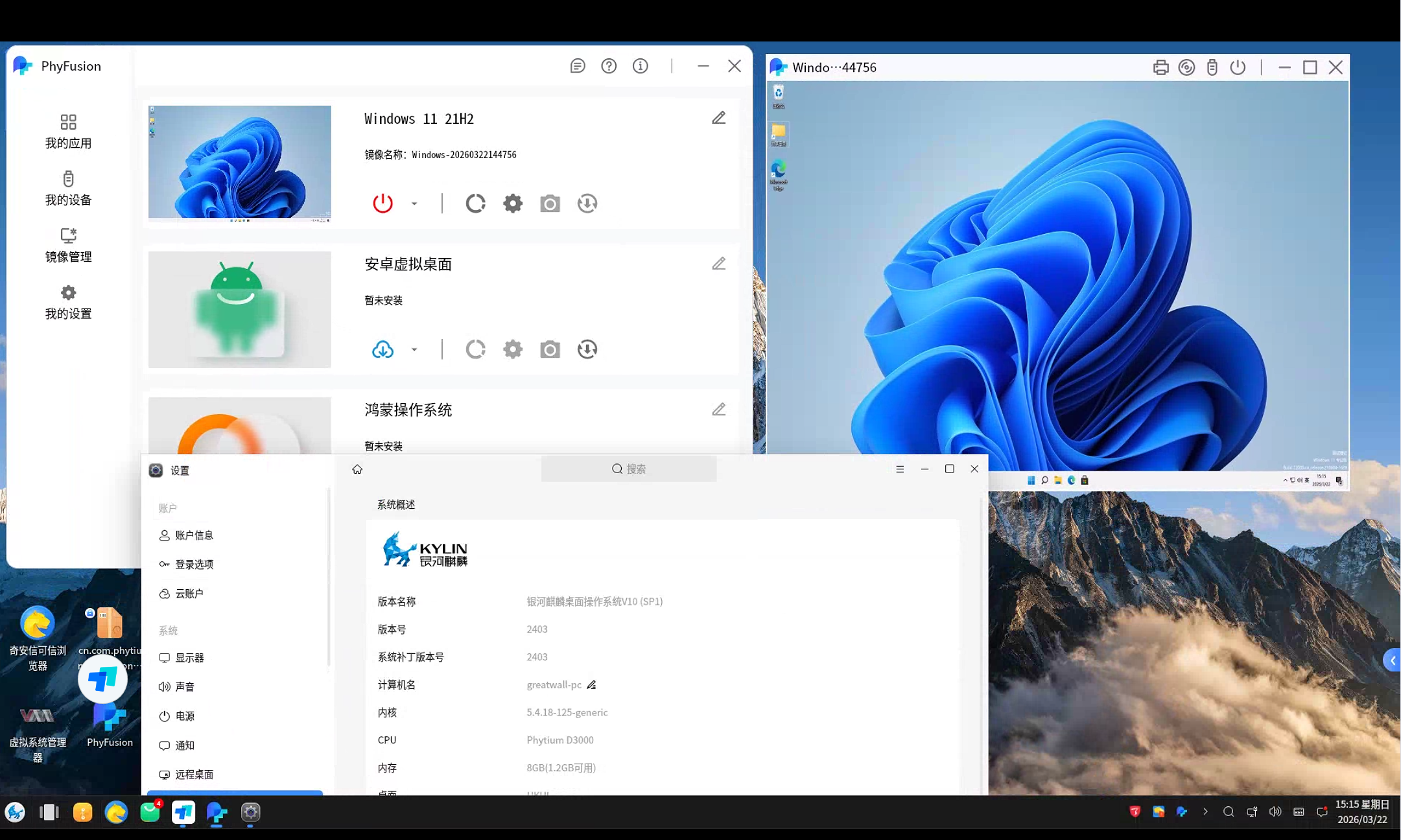 在飞腾处理器(如D3000/D2000/FT-2000/4)的国产操作系统(如银河麒麟V10 SP1、统信UOS)上,通过PhyFusion安装Windows系统